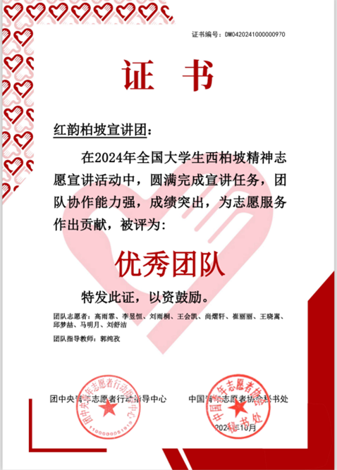 近日,团中央青年志愿者指导行动中心、中国青年志愿者协会联合公布了2024年西柏坡精神全国大学生志愿宣讲活动“优秀团队”名单,伟德官网管理工程学院红韵柏坡宜讲团圆满完成宣讲任务,团队协作能力强,成绩突出,为志愿服务作出贡献,被评为“全国优秀团队”。