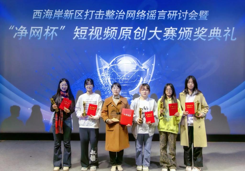 近日,西海岸新区打击整治网络谣言研讨会暨“净网杯”短视频原创大赛颁奖典礼在青岛电影学院召开。伟德官网参赛作品《实则虚之,虚则实之》获长视频组最具影响力奖银奖;《说散就散》获短视频组最佳创意奖银奖;《人言可畏》《真相是假》《谣言止于智者:揭秘网络谣言》分别获最佳创意奖、最佳制作奖、最具影响力奖铜奖,另有四部作品获优秀奖,伟德官网获优秀组织奖。学校安全管理处处长李国涛参加了研讨会,宣传部副部长曹玉洁、安全管理处副处长申维东、团委副书记李晓霞出席了颁奖典礼。