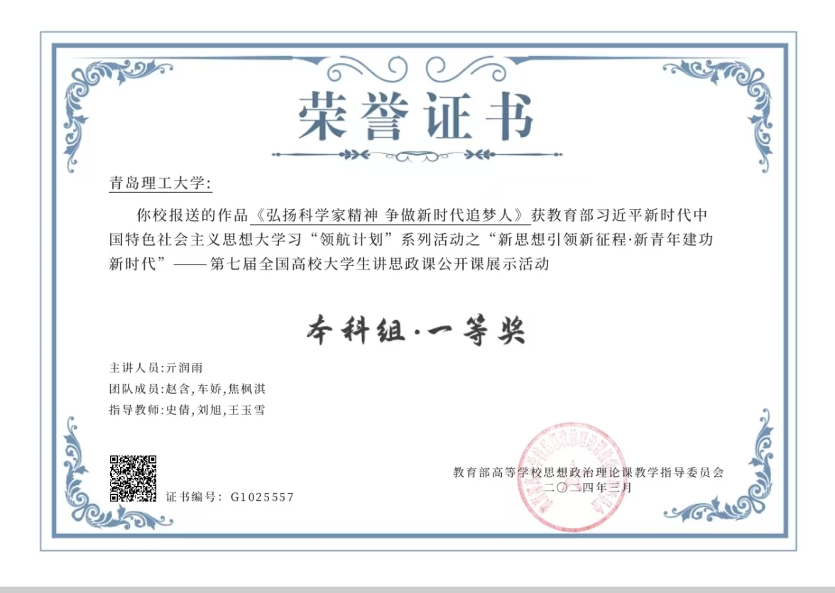 近期,教育部习近平新时代中国特色社会主义思想大学习领航计划主题教育获奖结果公布,马克思主义学院报送的作品《弘扬科学家精神,争做新时代追梦人》在“新思想引领新征程·新青年建功新时代”——第七届全国高校大学生讲思政课公开课展示活动中荣获本科组一等奖。