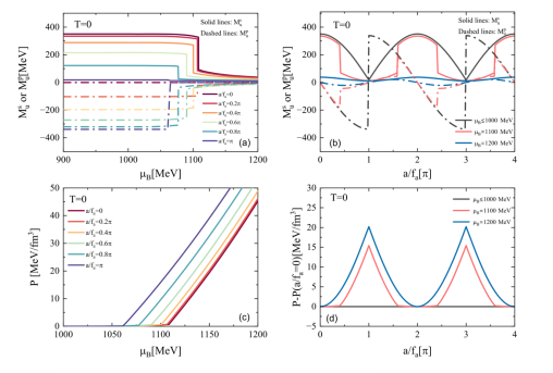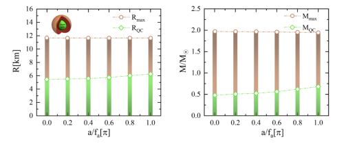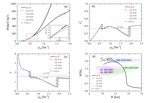 研究团队利用三味NJL模型并通过轴子场来描述强相互作用电荷-宇称(CP)对称性破缺效应,研究了轴子场对夸克物质和大质量致密星体的影响。研究表明轴子场降低了夸克物质一阶相变的重子化学势(重子数密度),将导致夸克物质状态方程的硬化和夸克星最大质量的增加。但是研究发现轴子场对包含强子-夸克相变的混合星物质的影响与预期相反。在轴子场作用下,强子-夸克混合相的相变起始点移至更低的密度,但软化了混合相物质的状态方程,这也导致混合星的最大质量和相应半径略有减少。重要的是团队还首次发现在轴子场作用下混合相起始点的降低却显著增加了混合星中夸克物质核心的半径和质量。因此研究结果表明,随着轴子场效应的存在,在2倍太阳质量(2M⊙)的大质量中子星中可以存在一个相当大的夸克物质核心。
