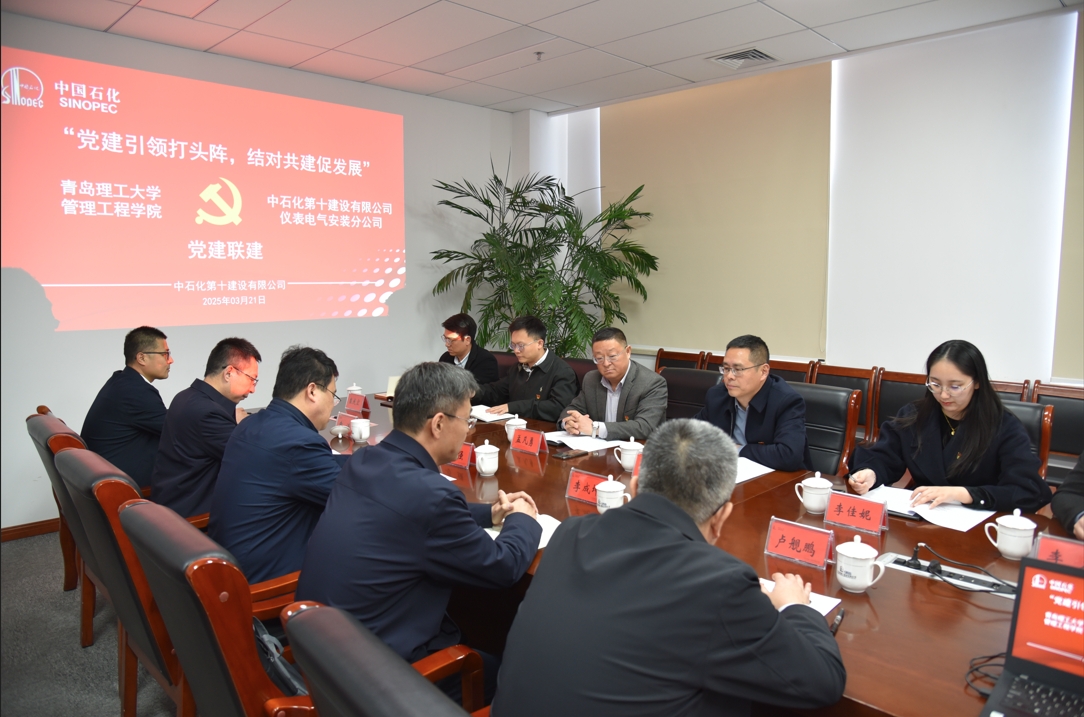 3月21日,管理工程学院党委与中石化第十建设有限公司仪表电气安装分公司党委在黄岛生产基地签署党建共建协议。中石化第十建设有限公司仪表电气安装分公司总经理、党委副书记马强,党委书记、纪委书记李成坤,副总经理、总工程师袁涛,副总经理卢舰鹏等班子成员,管理工程学院党委书记孟凡勇、党委副书记、副院长柳志广等师生党员参加共建活动。