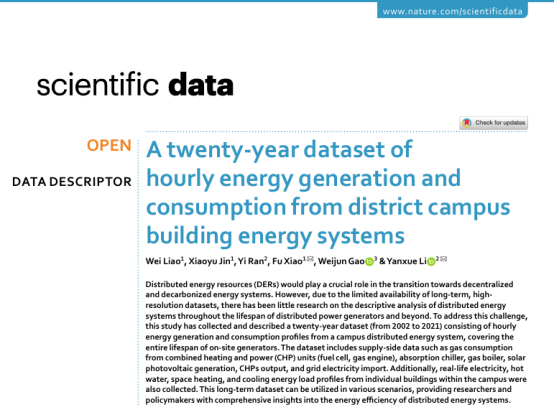 3.《Scientific Data:20年校园能源数据开放,助力碳中和》:Liao, W., Jin, X., Ran, Y., Xiao, F*., Gao, W., &Li, Y**. (2024). A twenty-year dataset of hourly energy generation and consumption from district campus building energy systems.Scientific Data, 11(1), 1400.