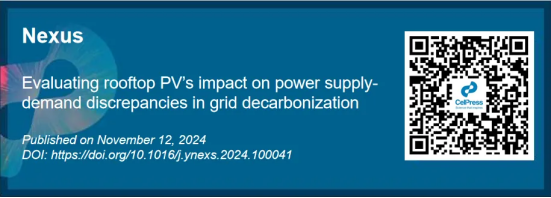 2. 《CELL子刊:屋顶光伏如何影响电网脱碳--九州实证》:Zhang, S., Pan, J., Lin, B.,Li, Y*., Ji, M., & Wang, Z**. (2024). Evaluating rooftop PV’s impact on power supply-demand discrepancies in grid decarbonization.Nexus, 1(4).