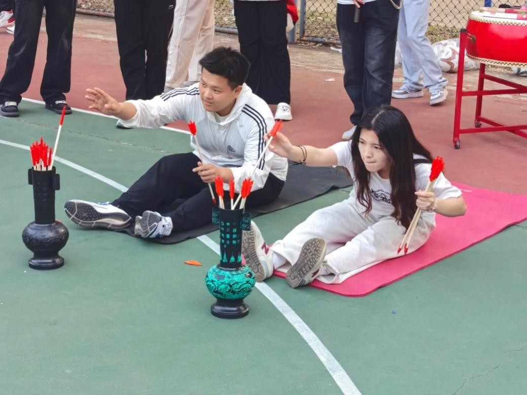 本次运动会设置了六个特色比赛项目,分别涵盖体测项目中的肺活量测试、立定跳远、坐位体前屈、50米跑、仰卧起坐(女)和引体向上(男),在传统体能测试中融入传统文化教育。“诗气满满”项目,参赛者通过吹气球获取古诗题目并作答,既考验肺活量又检验诗词积累;“烽火长征”项目,选手完成跳远动作后回答传统文化相关问题,实现体能锻炼与文化学习的双重目标;“投壶竞锋”项目,还原古代投壶游戏,参赛者在瑜伽垫上完成投掷,既传承礼仪文化又锻炼身体协调性。“蹴鞠折返”项目,将50米折返跑与蹴鞠射门相结合,展现了传统体育运动的现代演绎。专门为女生设计的“巾帼雅掷”和男生参与的“鹤运当头”项目,分别融入仰卧起坐、单杠等体质测试内容,使体育锻炼更具文化内涵。物理242班王琪琪说:“过参与本次运动会,我们不仅锻炼了身体,更深刻感受到了传统文化的独特魅力。”