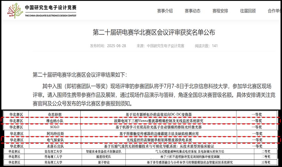 本届初赛吸引了来自三百三十三所高校及科研院所的8228支队伍,参赛人数约达25000人,规模之大、影响之广,均创下了历史新高。在此次竞赛中,伟德官网的参赛作品《故障电网下三相Vienna整流器精确控制及无线监控系统研究》(推荐单位:信息与控制工程学院,队长:杨新涛,指导教师:朱文杰,赵景波)、《无线监控的高频链单相矩阵整流器供电系统》(推荐单位:信息与控制工程学院,队长:王志宇,指导教师:田艳兵,宋传旺)荣获赛区一等奖,作品《基于三相不连续脉冲宽度调制的脉冲密度调制》(推荐单位:信息与控制工程学院,队长:宋世民,指导教师:庞清乐)、《气力式精量播种机集成电控系统及电驱调压控制方法》(推荐单位:机械与汽车工程学院,队长:王祥,指导教师:李宝刚)荣获赛区二等奖,作品《基于多传感器融合与小样本学习的钢筋腐蚀状态智能识别系统研究》(推荐单位:信息与控制工程学院,队长:沈嘉慧,指导教师:林旭梅)荣获赛区三等奖。