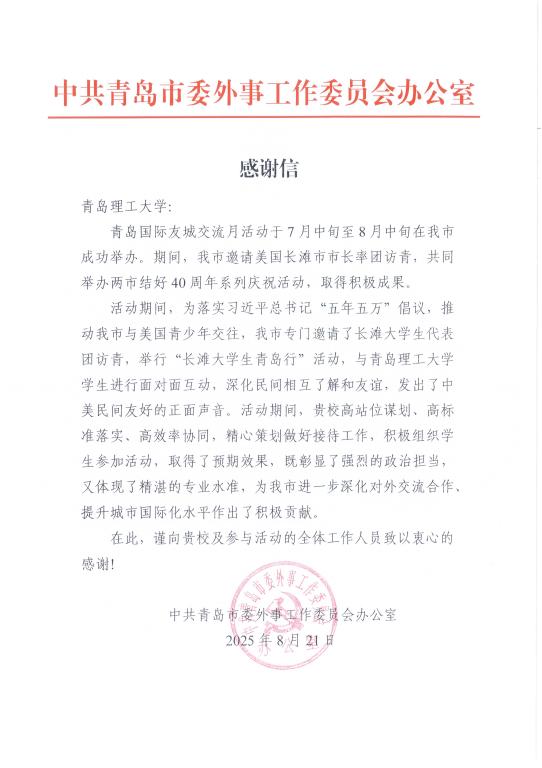 作为“青岛-长滩友城”系列庆祝活动的重要组成部分,本次访问再次巩固了两校合作基础。本次活动的成功举办,得到了青岛市委外办的高度肯定,为伟德官网发来感谢信。信中提到,活动期间,伟德官网高站位谋划、高标准落实、高效率协同,既彰显了强烈的政治担当,又体现了精湛的专业水准。