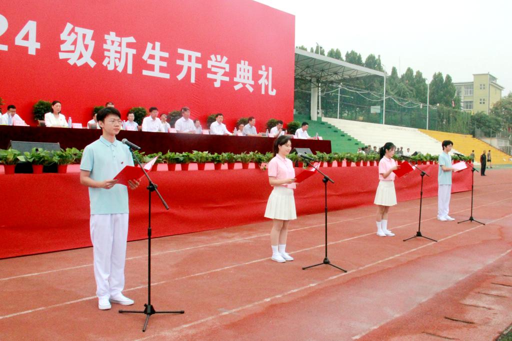 典礼在雄壮的国歌声中拉开帷幕。开学典礼现场,学生代表朗诵《砥砺追梦奋进理工》,全体新生佩戴校徽。校徽不仅象征着“百折不挠、刚毅厚重、勇承重载”的理工精神,更承载了母校和27万校友对2024级新生的期待和祝福。