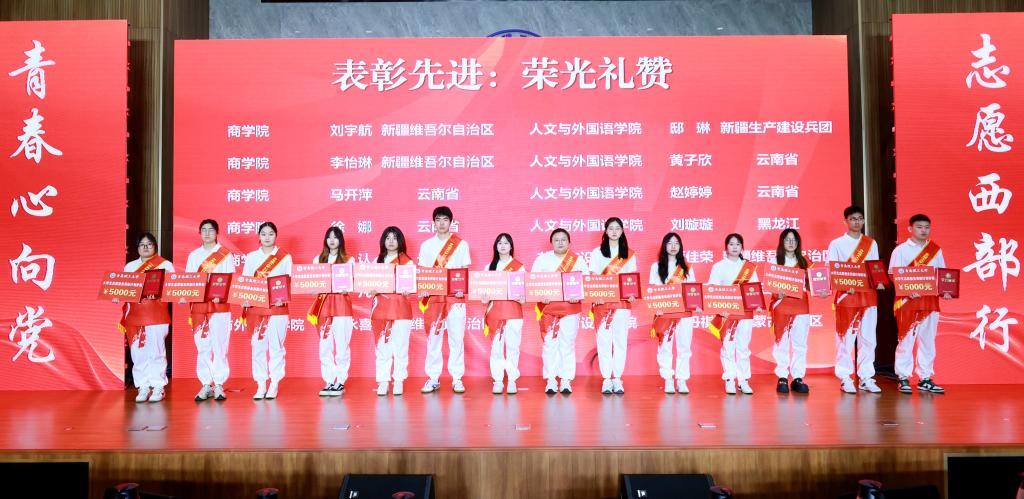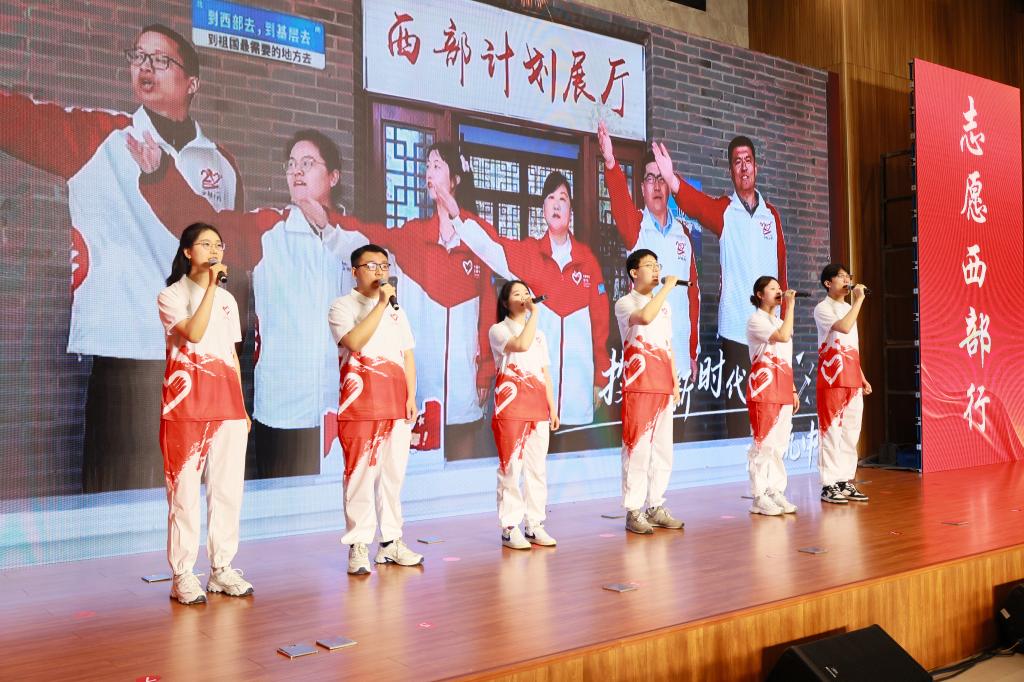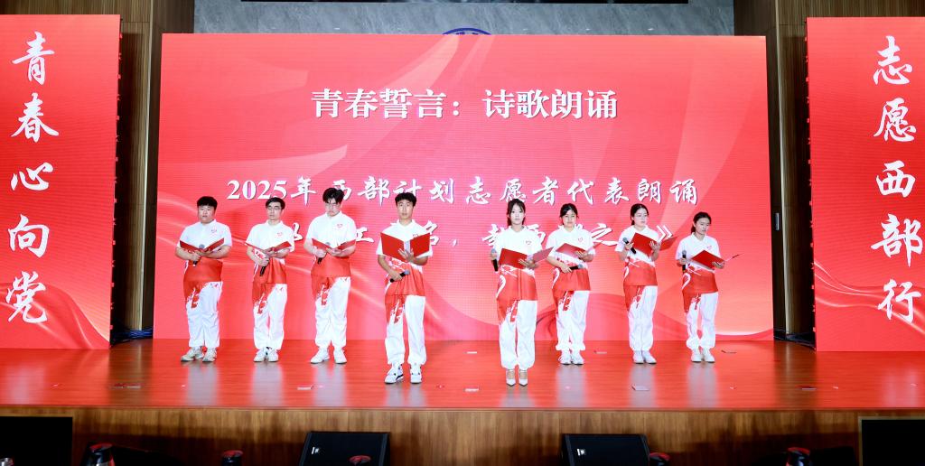 仪式上,全体师生共同学习习近平总书记重要讲话和给谢依特小学戍边支教西部计划志愿者服务队队员回信精神。校团委负责人宣读《关于表彰2025年西部计划志愿者的通报》,志愿者们依次登台接受表彰。学校领导老师为各省份志愿服务团授旗。学校西部计划志愿者代表进行了诗歌朗诵,传递扎根西部、服务基层的坚定信念。往届志愿者以视频形式向母校汇报自己在西部的学习、生活和工作情况,志愿者代表王浩群和陈宇建分别作交流发言。全体志愿者在仪式上庄严宣誓、齐唱西部计划主题曲《到西部去》。