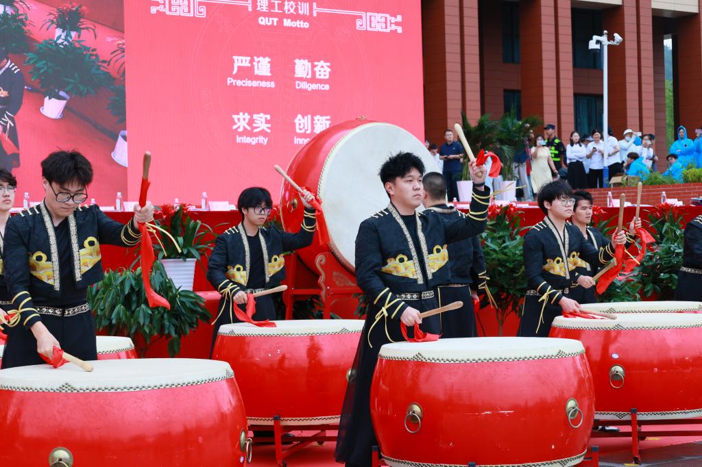 毕业典礼上,12名在校大学生代表带来《男儿当自强》中国鼓表演,18名师生代表共同演绎《年轻的战场》《倔强》《我的未来式》等6首歌曲串烧,全场师生合唱《理工之歌》,艺术与设计学院绘画专业学生将精心挑选的毕业创作作品捐赠给学校,用毕业捐赠完成对母校最深情的“回响”,整场毕业典礼成为了一堂沟通心灵、启智润心、激扬斗志的“大思政课”。(撰稿:王云霞;审核:董兰国)