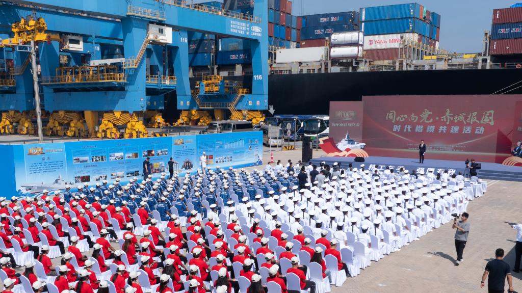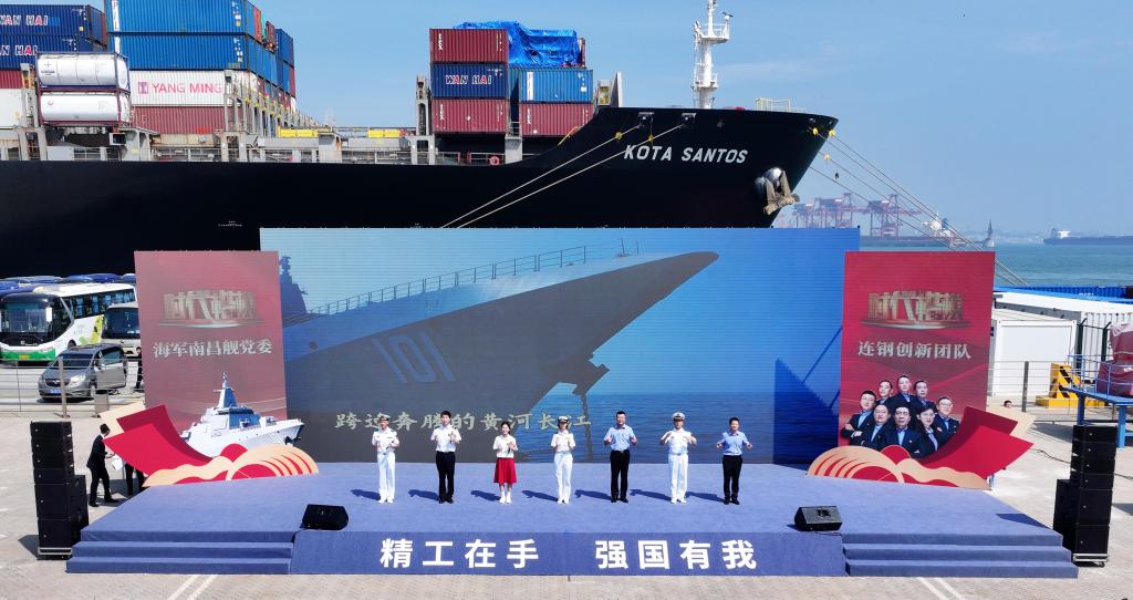 活动现场,师生近距离观摩南昌舰官兵与港口职工示范打绳结、穿戴防护服等专业技能展示,并围绕操作规范、应用场景、技术难点等方面,与示范人员展开深入交流。拉歌环节中,学校200余名师生组成的方阵现场合唱《歌唱祖国》,铿锵有力的合唱引发全场共鸣,师生们手中挥舞的国旗与现场声浪交织成爱国主义教育的鲜活画面。