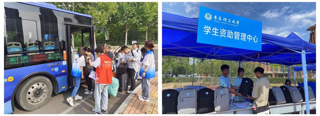 为了更好地服务新生,学校设置青岛火车站、火车北站新生接站点,校园内摆渡车来回穿梭,将新生及其行李井然有序地送至各学院报到处,学校开设绿色通道,发放150余份装有生活用品、学习用品、定制纪念品的爱心大礼包和60余套卧具和军训服装;将新生购买被褥提前放至床铺上,让新生轻松拎包入住;设置家长休息区、行李存放区、志愿服务站、医疗服务站、失物招领处等服务平台,为新生及家长提供全方位贴心服务……