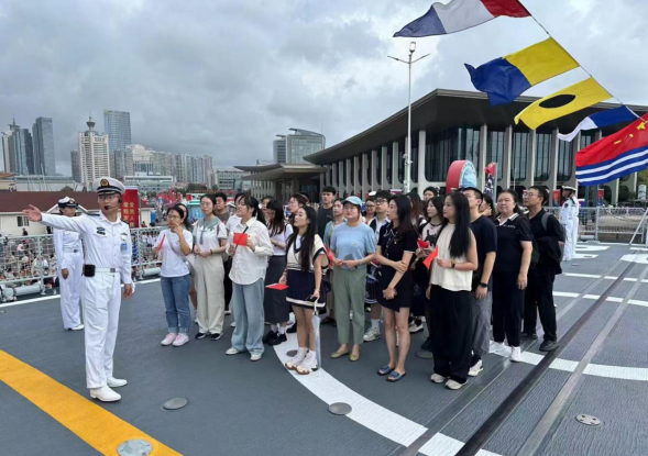 在奥帆中心码头,学院党委副书记范晓光、研究生辅导员带领研究生党支部参加庆祝中华人民共和国成立75周年北部战区海军舰艇开放日活动。师生党员参观了导弹驱逐舰唐山舰和导弹护卫舰邯郸舰,零距离感受海军现役舰艇的风采,了解人民海军发展壮大的历程。“能近距离看到护卫伟大祖国的‘大国重器’真是太荣幸了!走在甲板上,仿佛看见它们在执行任务中的飒爽英姿,我从中深切感受到了中国海军向海图强、砺剑深蓝的时代航迹,感受到了祖国的伟大富强!作为研究生,我一定会尽我所能投身科技创新,把论文写在祖国大地上!”研究生党员陈赵慧参观后说道。