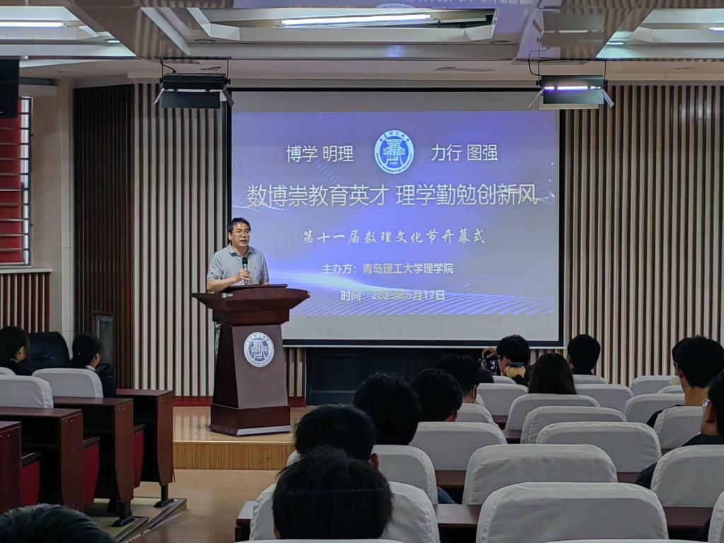 5月17日,理学院第十一届数理文化节开幕式在西海岸新区主校区主教学楼一楼东报告厅举行。校团委书记苏伟,学生工作处副处长王振,西海岸志愿服务协会会长王利辉,理学院院长孔亮,理学院党委副书记、副院长纪玉超,理学院副院长张效伟以及学院各教研室主任,全体学工干部以及100余名师生参加开幕式。