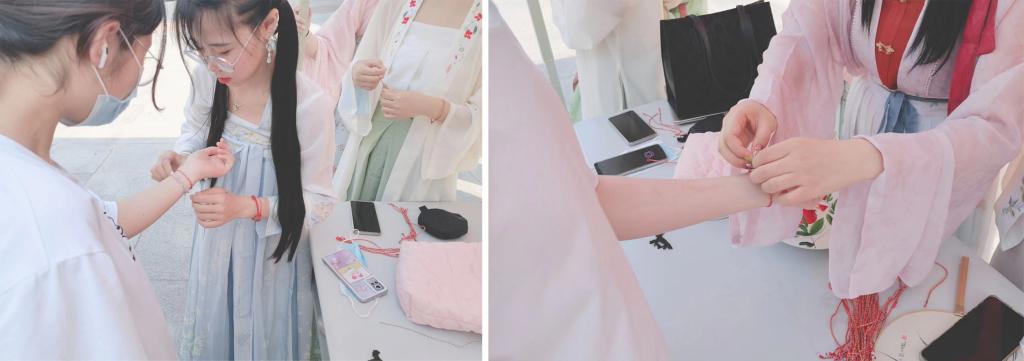 重温多样习俗,感悟文化自信。在“夏色倚艾青,浓情伴端午”活动中,来自清涟华裳汉服社的同学们以编织五彩绳为媒,把祈福纳吉的美好祝福传递给身边的朋友。“五彩绳竟然是如此神奇的绳子,我真的深深为博大精深的中华文化所折服,而且我也感受到了浓浓的同学情”。商学院孙顺英在参加完活动后表示。来自建筑与城乡规划学院的同学们用香囊、祈福牌、五彩绳与艾草等材料,一起亲手参与端午节吉物的制作。小巧玲珑的香囊,传递出浓浓的祝福。活动结束后,同学们还纷纷在祈福牌上留下美好的祝福,并与自己的劳动成果拍照留念。