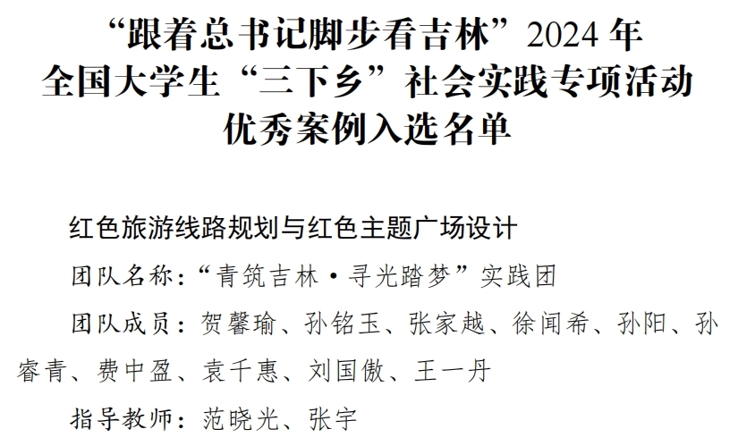 近日,由共青团吉林省委指导开展的“跟着总书记脚步看吉林”2024年全国大学生“三下乡”社会实践专项活动,来自省外221所高校、省内66所高校的3163支大学生实践团队围绕“红色吉林”“产业吉林”“粮仓吉林”“大美吉林”“边疆吉林”五个调研主题,在吉林省各地完成社会实践活动,最终经专家评审,全国共150支团队入选优秀案例。建筑与城乡规划学院“青筑吉林·寻光踏梦”实践团、“吉行筑梦,智绘城光”实践团入选专项活动优秀案例,并受到共青团吉林省委员会、吉林省学生联合会致信表扬。
