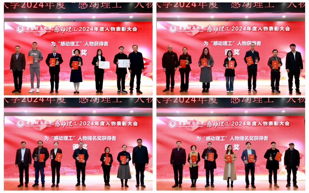李长河宣读2024“感动理工”人物表彰决定。与会领导为10名“感动理工”人物奖获得者、10名“感动理工”人物提名奖获得者颁发了荣誉证书和奖杯。“感动理工”人物颁奖词带领全场师生总结了获奖集体和个人取得的荣誉和成绩,回顾了他们奋勇追梦、踔厉奋发的点点滴滴。他们为全校师生树立了爱岗敬业、甘于奉献、拼搏进取的榜样。